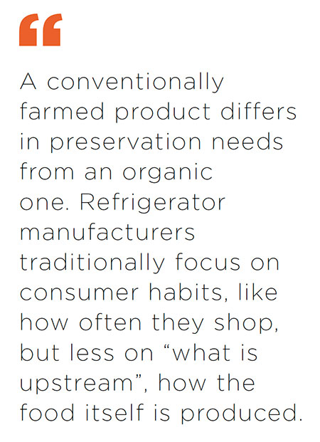needs from an organic one. Refrigerator manufacturers traditionally focus on consumer habits, like how often they shop, but less on “what is upstream”, how the food itself is produced.